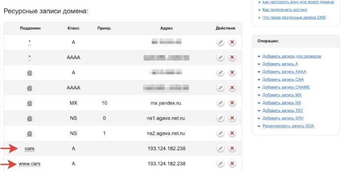 Добавьте две A-записи: для поддомена cars и www.cars удалите AAA-записи и добавьте/измените IP адрес 84.201.185.50.