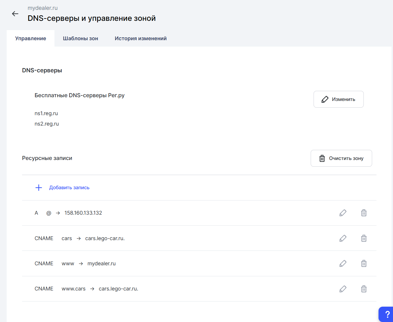 | CNAME | cars | cars.lego-car.ru. | Для поддомена указываем CNAME запись на домен cars.lego-car.ru |