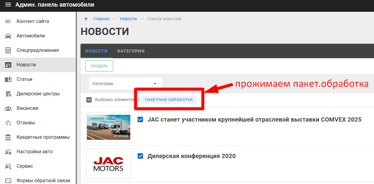 2. После выделения элементов появляется кнопка «Пакетная обработка». Кликаем по ней.