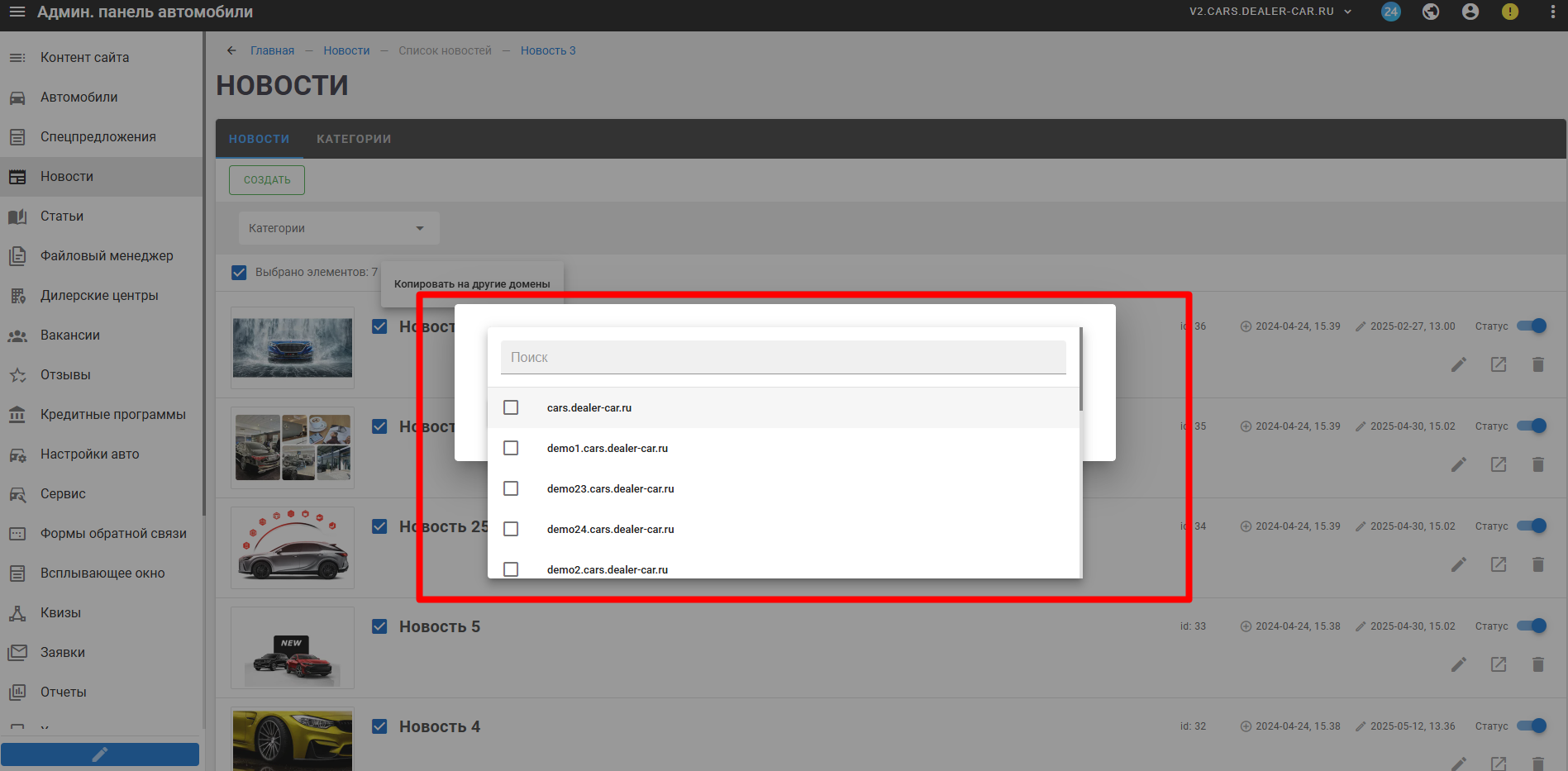 4. Появляется попап с мультиселектом и поиском по доменам на которые можно скопировать элементы.